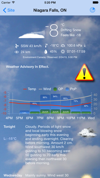 يرجى ملاحظة أن الرادار والرسوم البيانية الساعية قد لا تكون متوفرة في جميع المواقع. ومع ذلك، يوفر التطبيق لا يزال معلومات طقس موثوقة بناءً على بيانات من بيئة كندا و/أو NOAA/NWS.